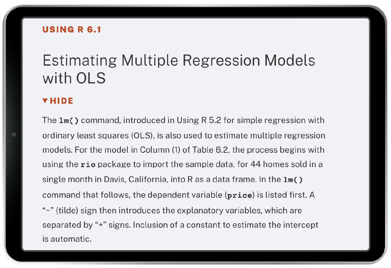Econometrics students need to use computer tools to solve complex problems. Our text emphasizes developing experience with code as a marketable skill, with optional “Using R” boxes in each chapter and downloadable data sets for both R and Stata.