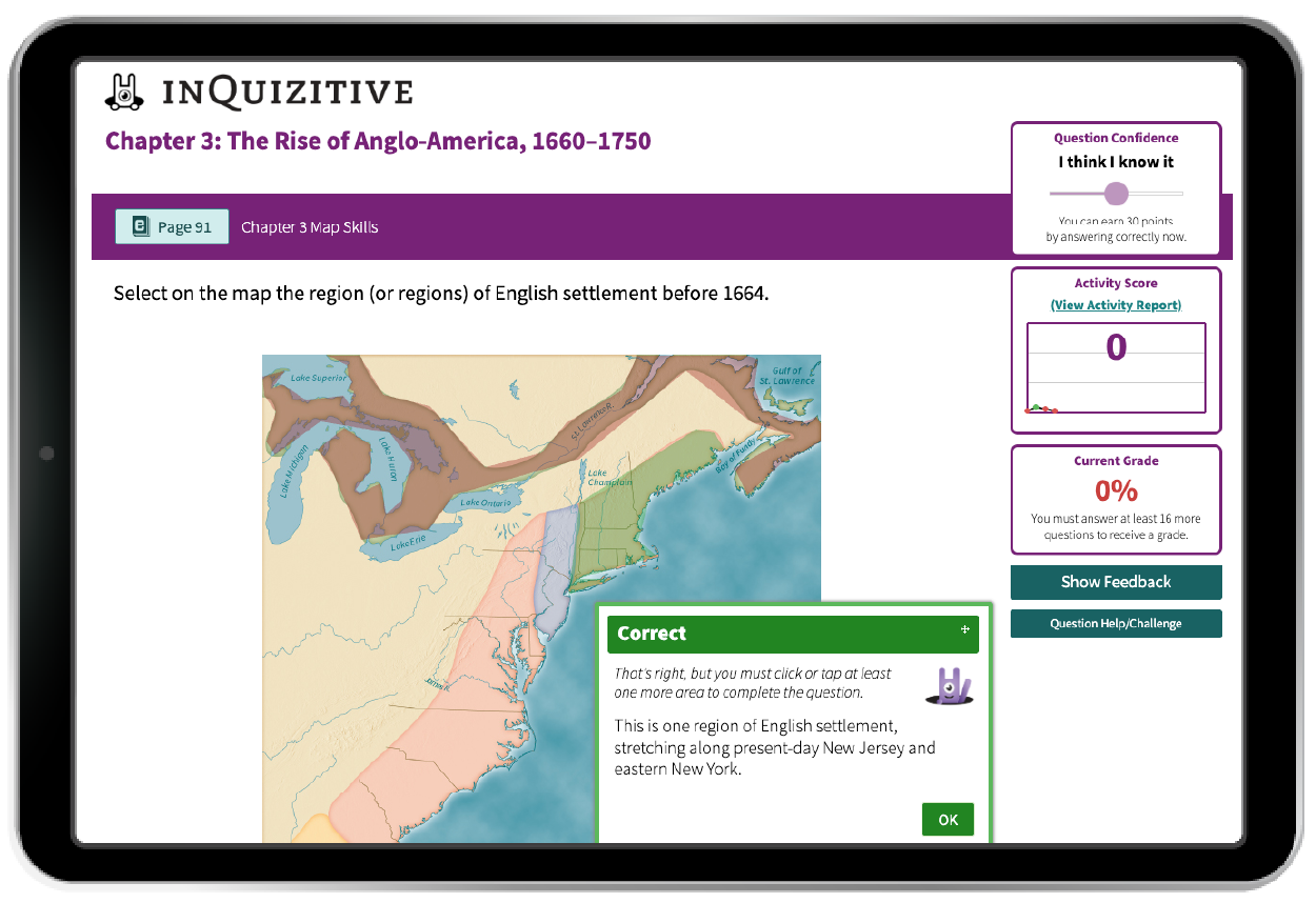 For students, InQuizitive is a low-stakes adaptive learning tool that helps them assess their comprehension once they have finished reading the chapter. Students receive a variety of interactive questions, including questions on historical developments and on the maps and primary sources from the chapter. InQuizitive adapts to the needs of each individual student and promotes a growth mindset that they can succeed if they put in the effort.