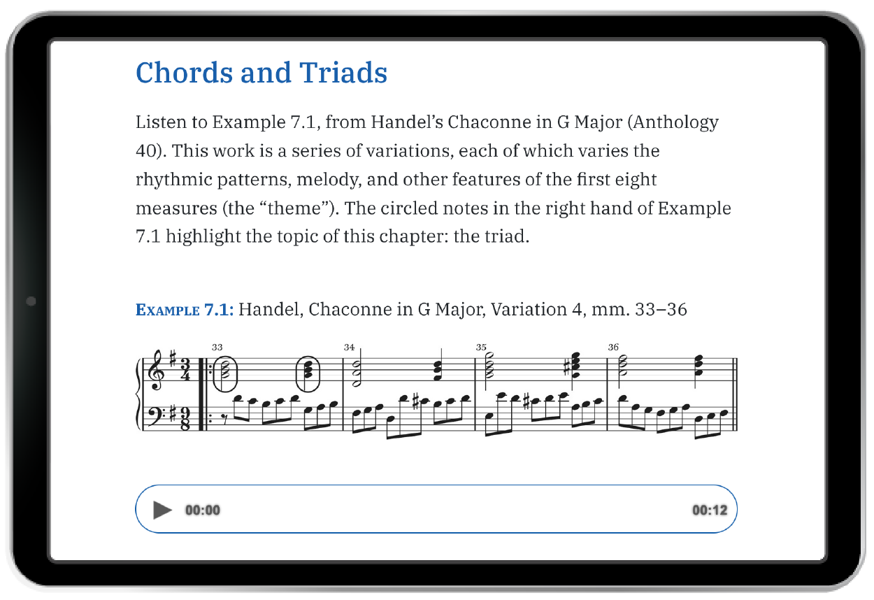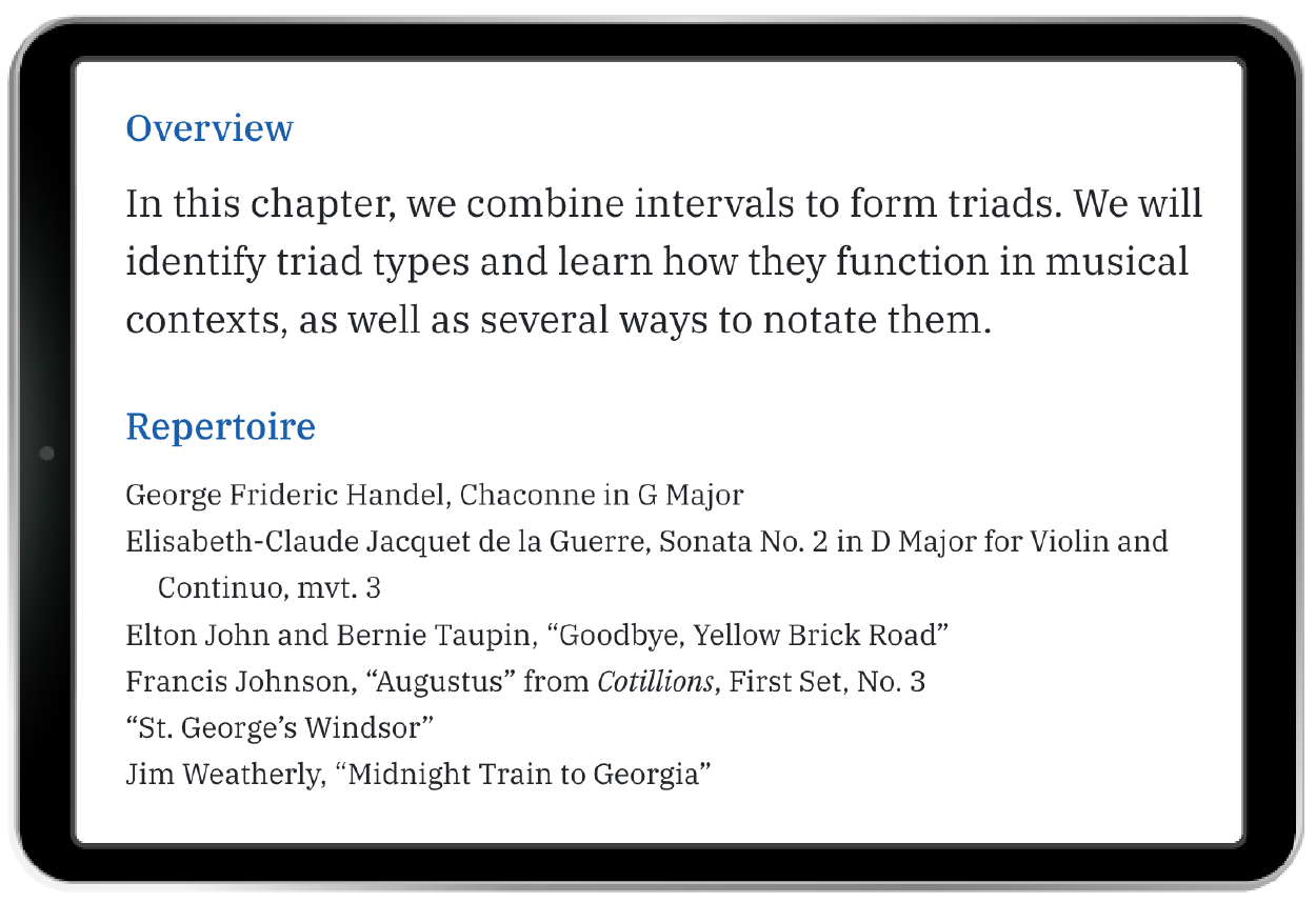 Spend some time reading through Chapter 7, Triads to see the engaging writing style, accessible explanations, and strong pedagogical structure in The Musician’s Guide to Theory and Analysis.