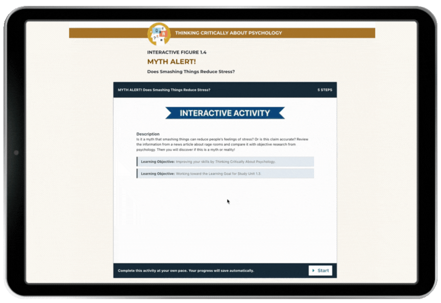 Help students succeed—in class and beyond—with interactive, evidence-based activities. Exercises like sleep assessments and growth mindset reflections encourage students to apply psychological concepts to their lives, while critical thinking activities like Myth Alerts! develop analytical skills through examining claims and distinguishing fact from fiction.