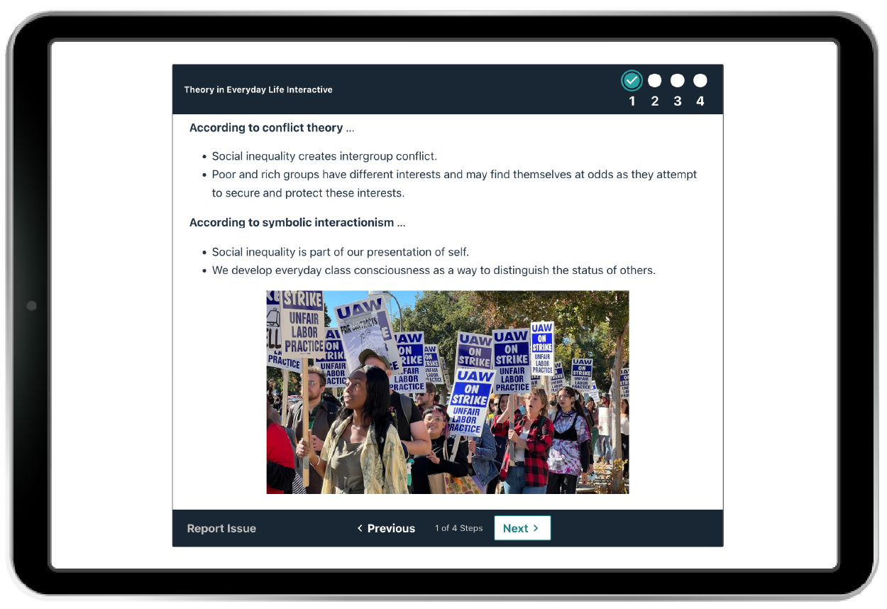 Theory in Everyday Life interactive activities walk students through the major theories covered in each chapter and then give them practice applying those theories to real-world issues such as plagiarism, poverty, and outsourcing.